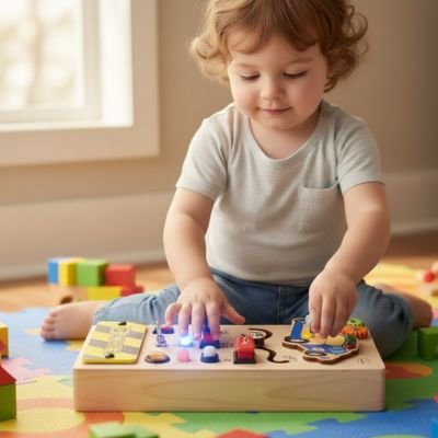 Contrairement aux busy boards basiques, nos modèles intègrent des lumières LED interactives qui captivent l'attention et enseignent la relation cause-effet. Le design en bois massif garantit durabilité et esthétique premium. Chaque tableau est conçu pour grandir avec l'enfant grâce à des activités multi-niveaux.