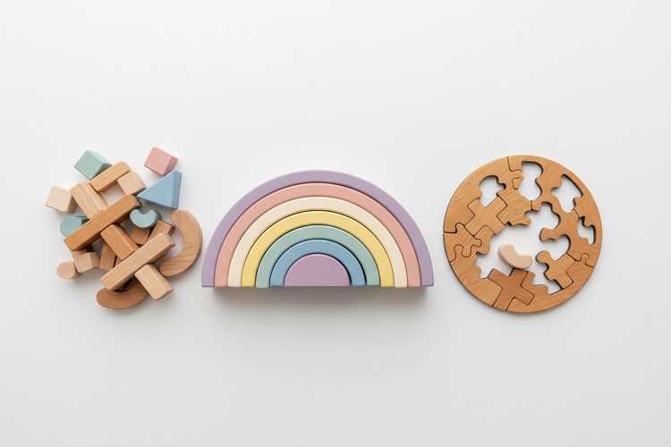 Les jeux en bois développent la motricité fine, la coordination, la pensée spatiale et offrent une expérience sensorielle riche. Le poids et la texture du bois stimulent le toucher et la proprioception.
